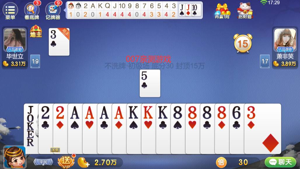 如果说神算子是靠大脑回路的高度旋转精算出来,那么简单点,会猜也是一项技能,尤其是在斗地主游戏中!玩家在玩《云中王牌斗地主》游戏时除了会记牌,猜牌也是必不可少。要是两者能够结合在一起,那么就是最强神算子!